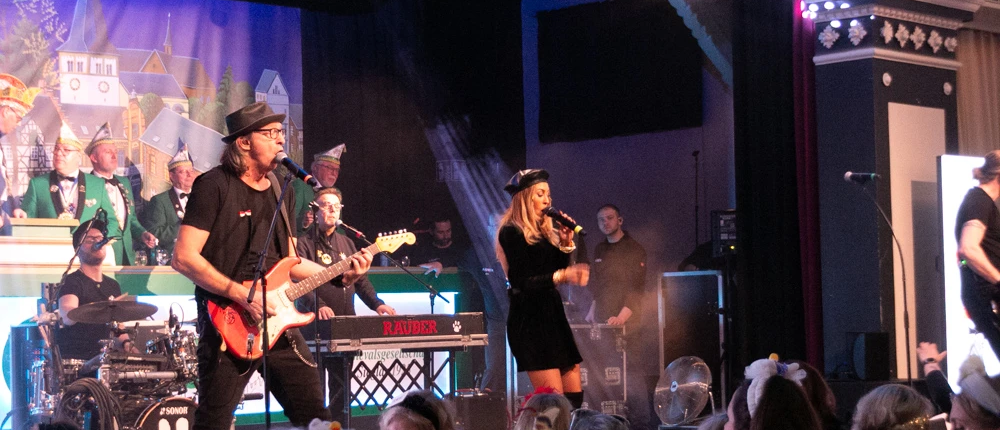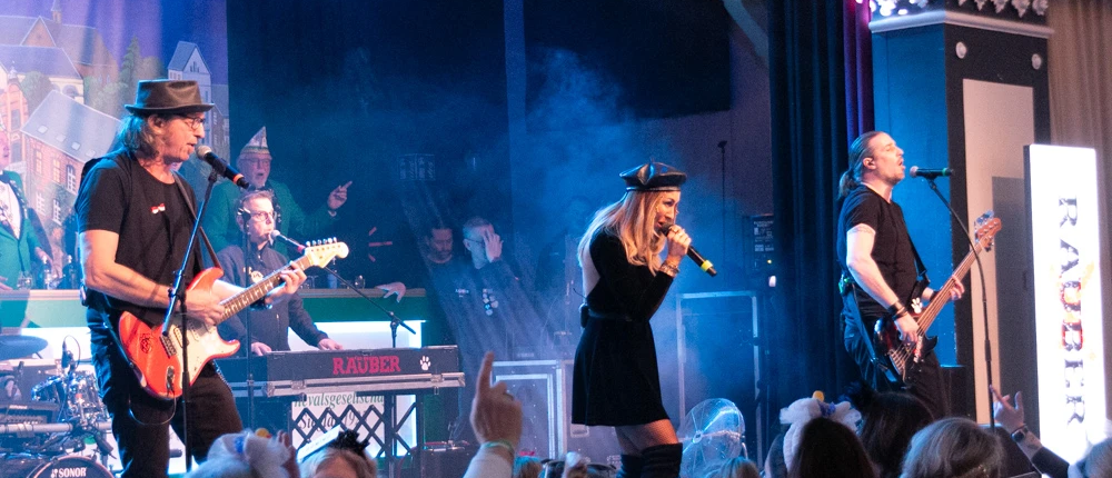 Und schon die nächste Band, die „Räuber“. Mit ihrem Gründungsmitglied Kurt Feller und ihrem jecken Bassisten Andras Schrader wissen sie Ihr Publikum schon 34 Jahre zu begeistern. Krankheitsbedingt konnte Frontsänger Sven West nicht dabei sein. Sie hatten prominenten Ersatz mitgebracht. Die Sängerin Linda Teodosiu forderte mit gymnastischen Übungen zum neuen Hit „Oben, unten…“ und natürlich mit dem „Trömmelche-Lied“ zum Mitmachen heraus. Die Mädels waren begeistert.